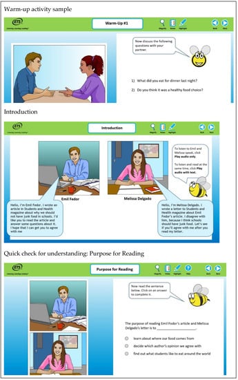 In developing assessment tasks, a few design features were applied to make this tool specific to EL students’ needs. Those features included: (a) providing warm-up tasks in order to activate EL students’ background knowledge on the topic of reading; (b) integrating multiple language skills for students to unpack the passage to build comprehension (e.g., a text-to-speech feature, tasks requiring students to discuss and write about the reading topic); and (c) providing scaffolded tasks while modeling a reading comprehension process (e.g., sequencing the tasks to help students do a close reading of the text). Hence, several warm-up tasks were designed for teachers to select at their discretion. For example, a warm-up task asked students to talk in pairs on a topic relevant to the reading passage prior to reading the passage. The main tasks in the assessment, then, began with introducing two authors and telling students the purpose for reading. Figure 3 displays the screenshots of a few sample tasks in the beginning of the Activities component to illustrate these features. Although it is expected for students in Grades 6–8 to have foundational reading skills, tasks covering foundational reading skills were embedded in the tool as one way of scaffolding for EL students, considering their developing English proficiency. The assessment activities consisted of two parts. Part 1 was designed to be completed collaboratively with a peer and provided opportunities for a teacher to observe and interact with students while eliciting evidence about EL students’ reading skills. Part 2 was an individual assessment based on the same reading passages as in part 1. Appendix A provides some examples of part 1 and part 2 tasks to illustrate reading tasks devised to assess each subconstruct skill.