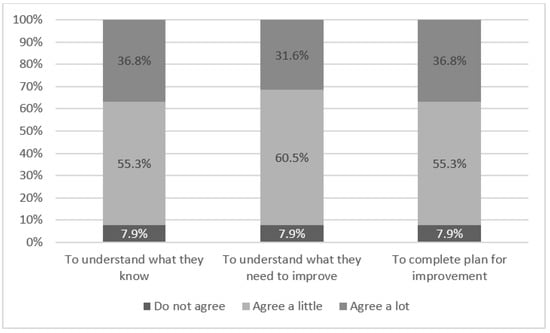 Figure 5 provides information about how students perceived the clarity and usefulness of the learning goals and the initial self-assessment (can-do statements) for understanding the learning goals stated in the formative assessment tool. Although some stated that the learning goals (50%) and the initial self-assessment (26.3%) were clear, these were not transparent to all students. However, many students indicated that the learning goals were useful in helping them understand the purpose of the activities and that the initial self-assessment was useful in helping them think about what they needed to do to complete the activities.