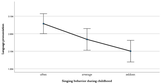 There was a significant main effect of the amount of singing during childhood and the performance of the pronunciation tasks, F(2, 89) = 6.98, p < 0.002, ω = 0.34. There was also a linear trend, F(1, 89) = 13.75, p < 0.01, ω = 0.35, indicating that the more the participants sang during childhood, the better they performed in the language pronunciation tasks. Planned contrasts also revealed that the group which sang most often performed significantly better in the language tasks than the group which sang seldom t(89) = 3.71, p < 0.001, r =0.37. For the other groups, no statistical difference was observed, but the linear trend shows that the “often” group (M = 2.97, SD = 1.01) performed best, followed by the “average” (M = 2.52, SD = 0.76) and the “seldom” (M = 2.19, SD = 0.67) groups (see Figure 1).