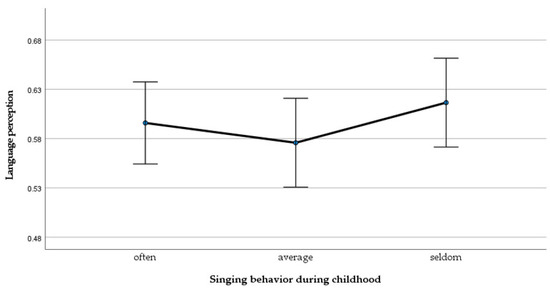 A separate ANOVA for the speech perception tasks revealed that no significant effect on the amount of singing during childhood and language perception could be detected F(2, 89) = 1.17, p > 0.05 (see Figure 4).