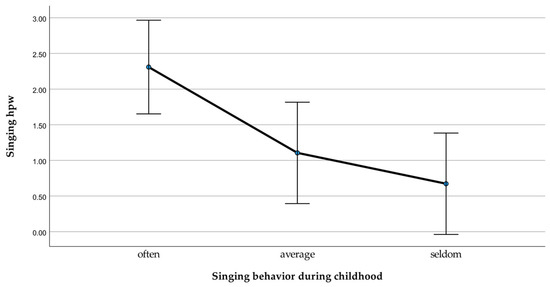 There was a significant main effect on the singing hours and the amount of singing during childhood (often, average, seldom), F(2, 89) = 6.18, p < 0.003, ω = 0.32. There was also a linear trend, F(1, 89) = 11.25, p < 0.001, ω = 0.30, indicating that the more the participants sang during childhood, the more hours they sing per week. Planned contrasts also revealed that the group which sang most often sang significantly more hours than the group which sang an average amount t(89) = 2.470, p < 0.015, r = 0.25 and the group which sang seldom t(89) = 3.358, p < 0.001, r = 0.34. For the average versus seldom group, no statistical difference was observed (see Figure 5).