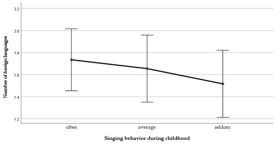 A separate ANOVA for the amount of foreign languages revealed that no significant effect on the number of foreign languages and the amount of childhood singing (often, average, seldom) could be detected F(2, 89) = 0.55, p = 0.577 (see Figure 6).
