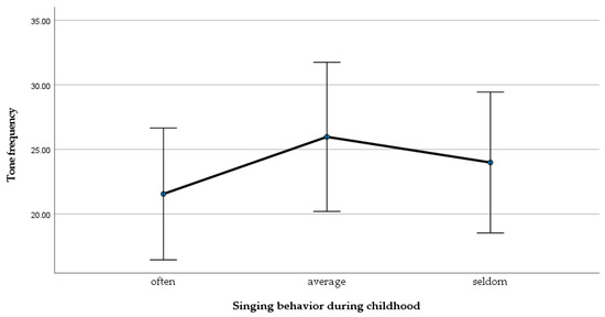 A separate ANOVA for the tone frequency measurement revealed that no significant effect on the tone frequency ability and the amount of childhood singing (often, average, seldom) could be detected F(2, 89) = 0.66, p = 0.519 (see Figure 7).