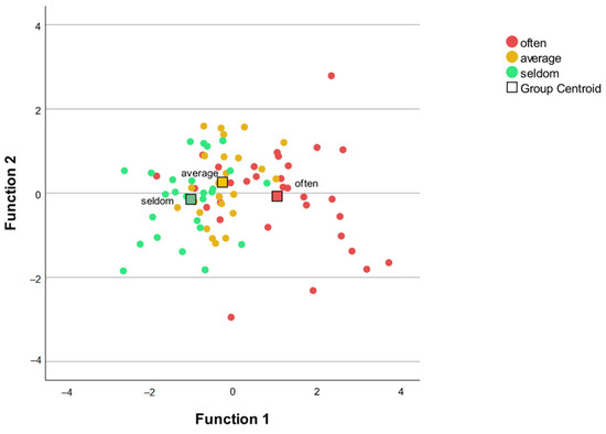 The MANOVA was followed by a discriminant analysis, which revealed two discriminant functions. The first explained 96.3% of the variance, canonical R2 = 0.44, whereas the second explained only 3.7%, canonical R2 = 0.02. In combination, these discriminant functions significantly discriminated the groups, Λ = 0.54, χ²(14) = 48.20, p < 0.001, but removing the first function indicated that the second function did not significantly differentiate the three groups Λ = 0.97, χ²(6) = 2.33, p = 0.89. The correlations between the outcomes and the discriminant functions revealed that the loads onto the first function are rather high for the singing ability (r = 0.90) and the language pronunciation (r = 0.53), while they showed rather low loads onto the second non-significant function; singing ability (r = 0.13) and the language pronunciation (r = 0.15). If the statistically recommended cutoff of value of 0.50 is used to decide which of the standardized discriminant coefficients are large (Warner 2013), the singing ability and the language pronunciation highly discriminate the groups. In the second non-significant function the singing hours per week (r = −0.59), tone frequency (r = −0.52), the AMMA test (r = −0.17), and the language perception measurement (r = −0.39) showed the largest correlation between each variable and discriminant function 2. Based on the singing ability and the pronunciation score, the group which sang very often in childhood can be differentiated from both of the other groups. The discriminant plot illustrates the finding (see Figure 8).
