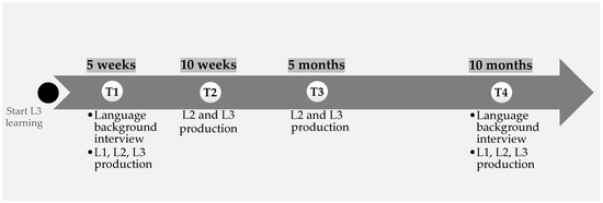 - Collect longitudinal data. In order to trace the development of interactions over time, both L2 and L3 should be tested multiple times. More specifically, Cabrelli and Rothman (2010, p. 282) propose monthly intervals over the course of the first year of exposure in a naturalistic setting. According to their predictions for simultaneous vs. sequential English/Spanish bilinguals acquiring Brazilian Portuguese, both groups would initially exhibit significant Spanish→BP transfer regardless of language status due to the two languages’ typological proximity. This influence is predicted to diminish relatively quickly for the late bilinguals and more slowly for the early bilinguals (for the latter group, it is thought to persist considerably longer because of the native status of their Spanish system). While the group of late bilinguals is expected to begin experiencing some steadily increasing L3→L2 influence early, only very little regressive CLI is forecast for the early bilinguals. To date, there has not been a longitudinal investigation to confirm or falsify these predictions of an interaction trajectory. Generally, longitudinal studies are rare to begin with (and perhaps more so for phonological research), let alone testing the same cohort of participants twelve times over the course of one year, each time with a lengthy testing battery including two or more languages and, as is discussed below, a variety of different phenomena in both modalities. Therefore, although the proposed methodology would certainly yield interesting insights regarding cross-linguistic interactions and language development, its feasibility can be called into question. In the present study, a compromise was implemented, collecting data longitudinally in all languages in the first year of L3 learning, but only with four testing times.