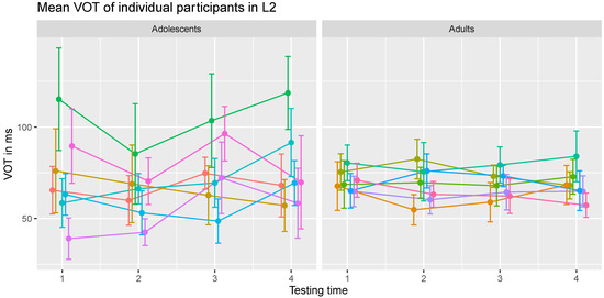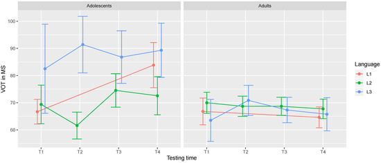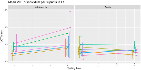 - Similar values for L1 and L2 at both T1 and T4 (e.g., BISC14 and MESC03 in the adolescents’ group; EDMU06, LYBO24, REBA03, and ROGI18 in the adults’ group): English and German, the two languages that would be expected to behave similarly, are in fact produced with overlapping VOT values at T1 and T4.