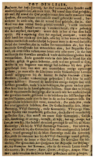 • Quality_Ease: …: het onderscheid van beteekenisse kann uit de reeden lichtelyk gemerkt worden. Noch dat achten wy geen onvolmaaktheid, maar een groot gemakk voor onse taale: want hoe sy minder veranderinge onderworpen is, hoe sy lichter vallt om geleert te worden. ‘… the difference in meaning can easily be inferred from the sentence. Yet we do not see that as an imperfection, but as a great convenience for our language: for the fewer inflections it is subject to, the easier it is learnt.’ (Leupenius 1653, p. 44; Caron 1958, p. 31).
