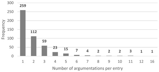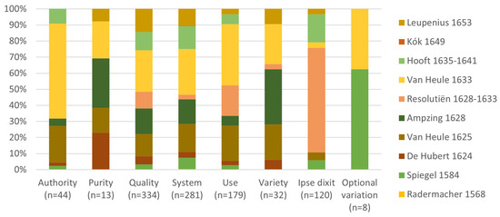 Figure 2 show that, when the selection and codification of certain forms was motivated with arguments, early modern grammarians often used more than one argument; on average, two arguments per entry were used, with a minimum of one (in 259 entries) and a maximum of 16 (in one instance only). Van Heule (1633), for example, used three arguments to motivate his choice for him for the third-person masculine personal pronoun for singular dative: (1) the word has been used voor duyzent jaren, by onze Voorouders ‘for a thousand years, by our ancestors’ (tag: Use_Historical), (2) de Hoochduytsen hebben ‘Im’ in plaetse van ‘Him’ aengenomen ‘the Germans have replaced ‘Him’ by ‘Im’’ (tag: System_Analogy_German), and (3) Ziet van der Mijle de lingua Belgica ‘See Van der Mijle’s On the Belgian Language’ (tag: Authority_Grammar) (Van Heule 1633, pp. 72–73; Caron 1971b, p. 52).