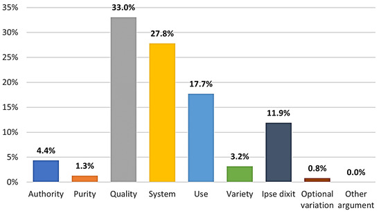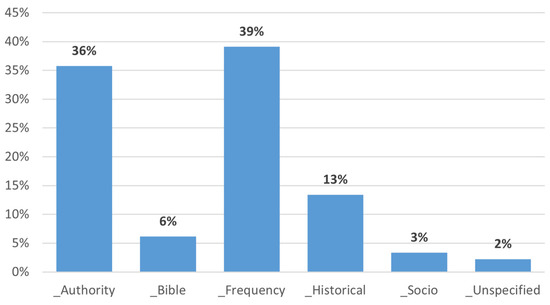 Additionally, Table 4 illustrates, on the one hand, that the majority of the 29 argumentation types that were attested were found very infrequently: 12 lower-level categories were encountered fewer than 10 times (each representing <1% of the total number of arguments found), four categories in between 10 and 20 times (1 to 2%), and four other categories 20–30 times (2 to 3%). On the other hand, it shows that the top five encountered argument types together made up over half of the total number of arguments (55.0%): Quality_Differentiation (12.2%), Ipse dixit (11.9%), System_Analogy (11.2%), System_Grammatical (10.6%), and Quality_Beauty (9.2%). This indicates that the values underlying these frequently used arguments in particular were part of the language ideology in this early modern period.