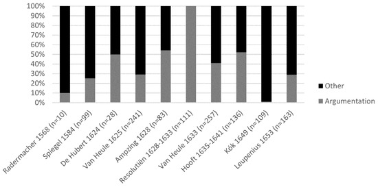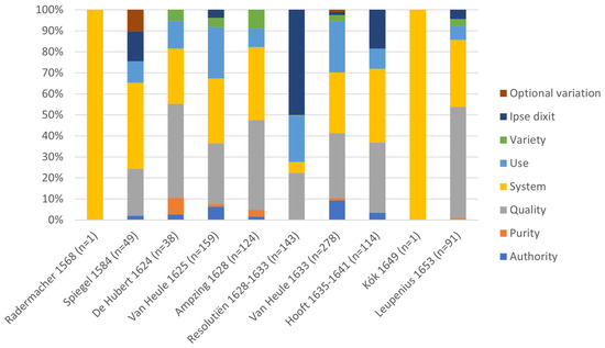 In total, the 490 argumentative grammatical entries included 1011 arguments. It is important to note that having taken unsampled data from 10 normative works that range about a century inevitably resulted in a skewed distribution (see Table 2): in Radermacher (1568; in Bostoen 1985) and Kók (1649), only one argument was encountered (of the types System_Grammatical and System_Nature, respectively), whereas Van Heule (1633) used 278 arguments (27.5% of all arguments encountered). This should be taken into account when interpreting the results presented in this section.