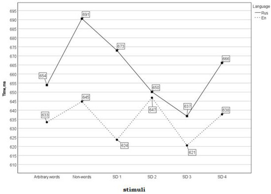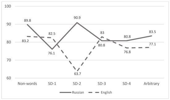 For the English groups SD-1 (χ2 = 8.239; df = 2; p = 0.016) and SD-3 (χ2 = 9.632; df = 2; p = 0.008), the effect was significant: the RA for these iconic words was higher than that for arbitrary words. The effect was also significant for the English SD-2 group (χ2 = 33.587; df = 2; p = 0.0001), however, the accuracy was lower. The result was not statistically significant for the English SD-4 group (χ2 = 1.390; df = 2; p = 0.499). The RA for the Russian SD-1 group (χ2 = 26.001; df = 2; p < 0.001) was significantly lower than that for arbitrary words. For the Russian SD-2 group, the RA was significantly higher than that for arbitrary words (χ2 = 28.953; df = 2; p < 0.001). For the Russian SD-3 and SD-4 groups, the result was not statistically significant (χ2 = 3.902; d = 2; p = 0.142).