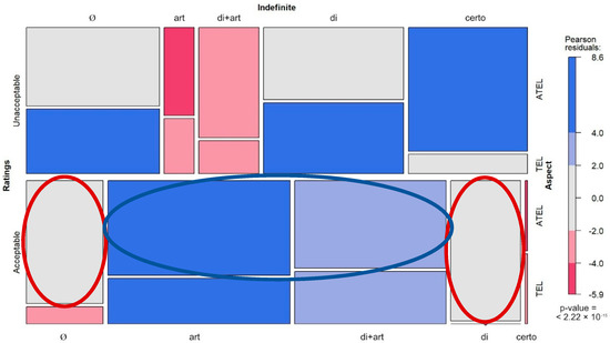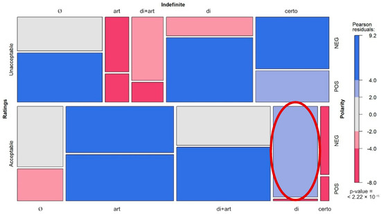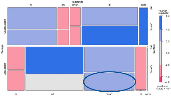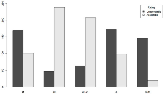 The results of their study suggest some optionality in the use of ZERO and ART across the whole peninsula. ZERO occurs more frequently than ART, especially in those lateral areas (Sicily and the north-east) in which the local varieties use ZERO as the unmarked form for core indefiniteness (cf. Cardinaletti and Giusti 2020, p. 709). Moreover, the results confirm the authors’ previous predictions that ART tends to specialize for saliency contexts, while di+art conveys small quantity interpretation. The latter determiner in informal Italian seems to be restricted to positive episodic sentences, and its occurrence is greater in Emilia-Romagna,10 even though it does not seem to be the unmarked form.