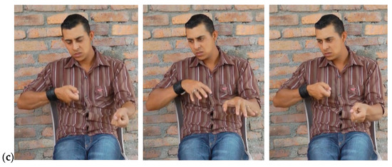 Examples for responses of iconic handshape types: (a) Handling [mop], (b) Object [hand saw], and (c) Handling+Object [rake]. See supplementary materials to view video clips of responses.