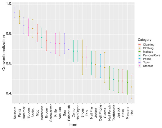 We now turn to the item analysis, to determine which individual objects and which semantic classes of object (clothing, grooming/cosmetic items, utensils, and handheld tools) exhibited a greater degree of conventionalization.
