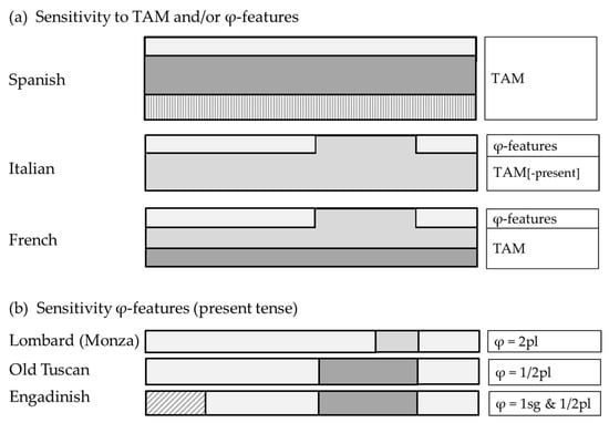 To sum up, Spanish has only TAM-sensitive suppletion, which is also called categorical (or inherent) suppletion, since it depends on categories inherent to the verb; Italian and French have additionally noncategorial (or contextual) suppletion, since φ-features are not primary categories of the verb, but contextually derived from agreement processes during the syntactic derivation (for the terminology, cf. Hippisley et al. 2004, as well as Veselinova 2006, 2017). Note again that noncategorial (contextual) suppletion, i.e., suppletion conditioned by φ occurs only in the present tense. Figure 2 shows the corresponding distributional patterns for go-suppletion: