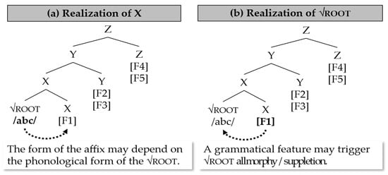 After the syntactic derivation, in DM, terminal nodes are handed over to VI. Vocabulary items are form-meaning correspondences and their insertion may be contextually conditioned by adjacent terminal nodes. Any context-induced surface variation of a morpheme could thus, in principle, be explained with VI. The contextual features triggering allomorphy are either phonological or morphosyntactic depending on whether the realization of the terminal node is inward- or outward-sensitive (cf. Bobaljik 2000). This idea is illustrated in Figure 3: when it comes to the realization of the terminal X, its form may depend on the phonological features of the vocabulary item previously inserted (and/or on following grammatical features). This is a case of inward context sensitivity, since the realization of X depends on the phonological shape of the root. In contrast, the realization of the root is outward sensitive. That is, the contextual feature [F1] of X, a grammatical feature, may condition root allomorphy (or suppletion) in (b).