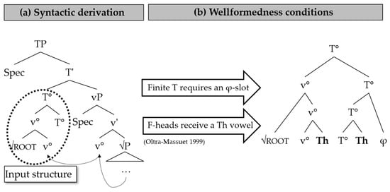 Syntactic derivation (a) and well-formedness conditions (b) (cf. Oltra-Massuet 1999).