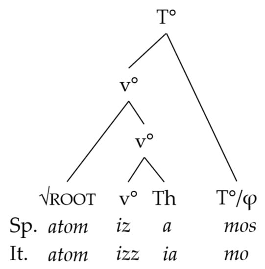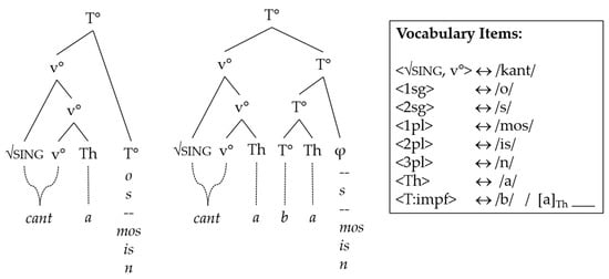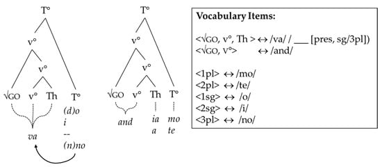 - Calabrese, Andrea. 2015a. Irregular Morphology and Athematic verbs in Italo-Romance. Isogloss. Open Journal of Romance Linguistics, 69–102. Available online: https://raco.cat/index.php/isogloss/article/view/304706 (accessed on 13 June 2022). [CrossRef][Green Version]