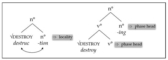 As for (1), domains correspond to phases: allomorphy can only occur when triggered in the same phase, i.e., in a locality condition. Even if linearly adjacent, elements belonging to different phases cannot trigger allomorphy. This is illustrated by the English examples destruction and destroying in Figure 7 (cf. Ingason and Sigurðsson 2015, p. 4; also Marantz 2013; Embick 2014):
