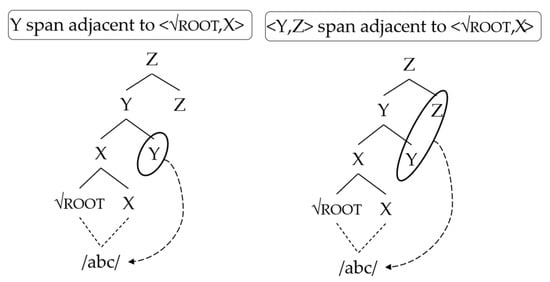 Thus, given the derivation in Figure 9, Y can trigger allomorphy on the root if, e.g., <√root,X> is realized as a span, since in this case Y would be an adjacent span. Something similar holds for Z: Z could trigger root allomorphy if, e.g., <√root,X> and <Y,Z> were realized as span.
