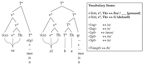 Things are quite different for the Spanish verb ir: The above segmentations are not possible for go neither in the present tense nor in the imperfect; if we compare the present tense forms of go in Table 6 with those of the regular verb cantar, we observe two differences, namely first that also in Spanish—as in Italian—in the va- forms there is no theme vowel, i.e., √ + φ; and second, that the first-person singular is extended by the ending -y [j], parallel to other very common short verbal forms in the first-person singular, such as doy, soy and estoy, as well as maybe the existential hay.13 In the imperfect, the verbal form can be segmented into more exponents; however, again there is no theme vowel following the stem, i.e., √ + T° + Th + φ. We see, thus, that both roots are athematic, just like the Latin etyma were athematic (cf. vadere with epenthetic /e/ and īre). This fact is still reflected in the modern Spanish verb.