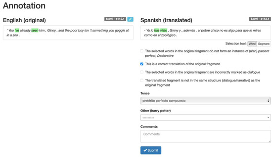 One reviewer asks about the rationale for annotating the corpus in the English original and not in one (or more) of the Spanish translations. We assume that staying as close as possible to the meaning intended in the original allows us to control for any artifact introduced by the translators (i.e., ‘translation-induced variation’, as opposed to grammatical variation).