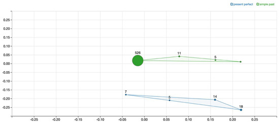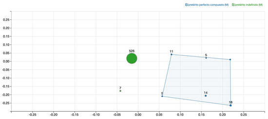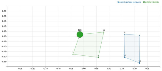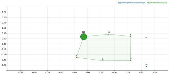 As for the Rioplatense data, when applying the same procedure, we obtain Figure 5, where we observe less perfect forms. While there are still 18 English Present Perfect forms that remain a perfect in Rioplatense Spanish, the remaining 26 English Present Perfect cases get translated into a PI in this translation. Moreover, there is only one case in which English displays a Simple Past and the Rioplatense translator opted for a PPC—the other 542 Simple Past forms produce an equivalent (perfective) past form, the PI, in this translation.