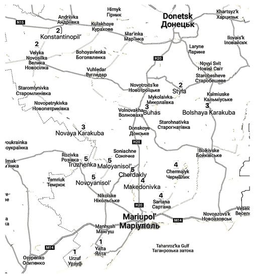 The main data for the analysis was collected by my colleagues from Saint Petersburg University (Elena Perekhvalskaya, Valentin Vydrin, Alexander Novik), 40 students and myself in 2001–2006. Due to a large number of participants, we were able to divide into several groups and to cover almost all Greek villages around Mariupol (see Figure 2). Special attention was paid to Urzuf, Yalta, Sartana, Novaya Karakuba, Buhas and Maloyanisol’. During the field research we managed to interview 139 speakers of different subdialects ageing from 6 to 97. Each researcher was responsible for a specific subject in phonetics, morphology, syntax, sociolinguistics, folklore or ethnography. Primarily, the data were collected by means of various questionnaires specially prepared for this project. Soon it became evident that this method is appropriate not for all speakers and narratives are much more reliable. We have recorded about 300 h of interviews and narratives3. The most important results of these expeditions are published in (; ).