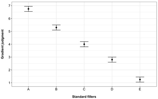 Figure 2. Expected rating distribution for the A–E levels of the standard fillers in (23) on a gradient judgment scale.