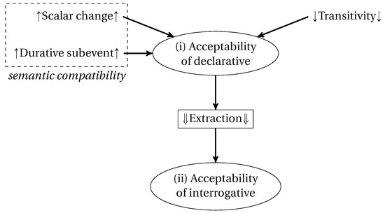 Figure 3. Acceptability model for BPPA constructions from Kehl (2021, p. 284); the factor scalar change corresponds to incrementality in this paper. Upwards arrows indicate a positive effect on acceptability, (double) downward arrows a negative effect.