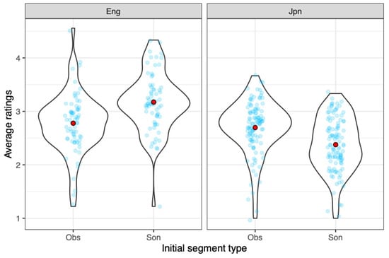 Figure 1 summarizes the results in the form of violin plots. Each transparent dot represents an average hardness rating from each participant. Each violin represents a normalized probability distribution of these averages. The thick red dots represent the grand average for each condition. The left facet represents the results from English speakers and the right facet those from Japanese speakers. Within each facet, the left violin shows the ratings of the obstruent-initial items, and the right violin shows the ratings of the sonorant-initial items.