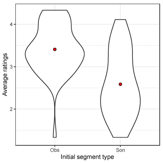 Figure 2 shows the results, again in the form of violin plots. We can observe that the items with obstruents were judged to be harder than those with sonorants and that this difference was statistically robust (beta = −1.57, z = −4.41, p < 0.001), a result that is compatible with a recent study by Sidhu et al. (2022). This result indicates that it is not the case and that English speakers find sonorants to be harder than obstruents.