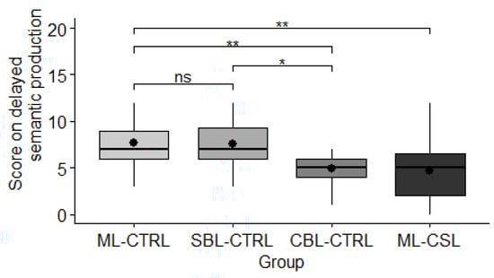 Analyses were performed using R statistical software (). The independent variable was Group (CBL-CTRL or CBL-CSL), and the dependent variables were scores on nonword repetition, phonological production, semantic production, and comprehension on immediate and delayed post-tests. Due to the small number of participants in this study, a non-parametric (Mann–Whitney) test with Bonferonni correction for adjusting p values was employed to compare inter-group performance.