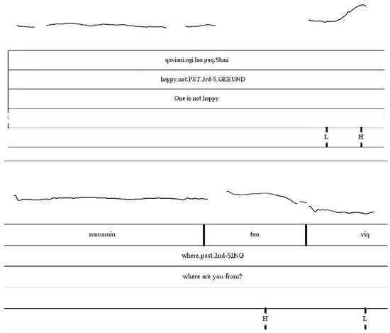 Realization of intonational contours in Inuktitut. Top: Rising contour to hold a turn; female speaker from Baker Lake (Shokeir 2009, p. 21). Bottom: Falling contour to indicate the end of a turn; female speaker from Iqaluit (Shokeir 2009, p. 24).