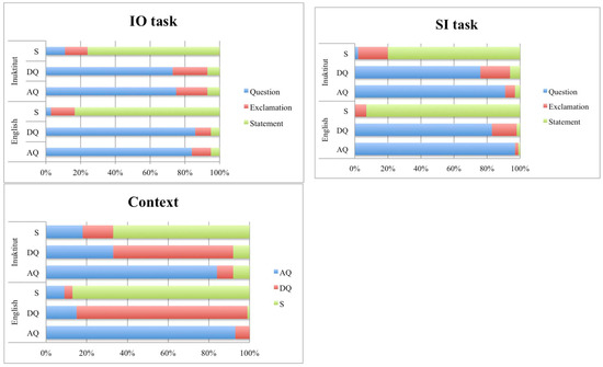 The perception tasks were administered using SuperLab pro. In the IO and SI tasks, participants listened to the stimulus, and then pressed one of the three colored keys on the keypad corresponding to Statement, Question or Exclamation. This last response was included since DQs could be interpreted as exclamations and there were exclamations among the distractors. In the C task, participants listened to the scenario and then heard three possible options that would complete the scenario, either a statement, a DQ or an AQ. Participants only listened to each stimulus once. After having heard the last option, they had to press one of the three keys on the keypad. Before testing began, we included a short practice session.