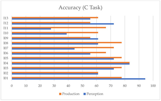 The results reported above reflect the behavior of both groups, but bilinguals have diverse language histories and their behavior is highly variable, so it is crucial to explore to what extent individuals mirror the group behavior. As seen in Figure 4 (see also Table 5), 10/13 speakers displayed accuracy values that were within one SD from the mean. Two speakers (I04 and I12) were above that threshold and one participant (I11) was clearly below one SD from the mean. Demographic variables may account in part for these results; I04 was a simultaneous bilingual, with college education who used both languages in equal proportions. I12 was the same age as I04, and, although she was exposed to English when she entered the school system, she reported using English most of the time. I11’s behavior, however, is difficult to explain with the information available, since his language learning profile was similar to I12’s and he was the participant who reported using English the most (Table 1). In the next section, we will compare these findings to the production results to better understand if his lower accuracy is a consequence of the perception tasks used, or if it reflects his overall performance.