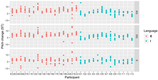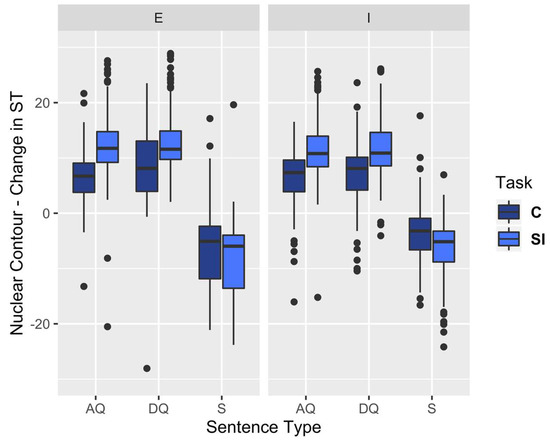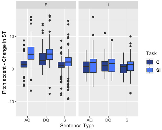 Finally, Table 4 displays the characteristics of the stimuli used in the C task (Perception only). Once again, the three sentence types differed in the degree of pitch change in the nuclear contour (DQ > AQ > S), although the pitch excursion was smaller in this task than in the others. Similar F0 maximum values were obtained for the first pitch accent in the three sentence types, but here, as opposed to the other tasks, the largest pitch excursion was produced in Ss.