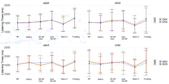 Due to working memory limitations, we believe that children take longer to process RCs and this may result in significant effects and interactions in post-critical segments in the child group. According to Felser et al. (2003), 10- to 11-year-old English children-speaking do not process ambiguous RCs similarly to adults on-line, but they do so in the subsequent off-line grammaticality judgment task (see analysis of Felser et al.’s (2003) study above). The different processing pattern between children and adults in the on-line task was attributed by Felser et al. (2003) to 10- to 11-year-old children’s still developing ability for automated use of lexicosemantic and textual cues. Our study includes a group of 11- to 12-year-old children. The main reason why we chose to include 11- to 12-year-old children in our study was to examine if children in that age group are actually able to successfully integrate all different types of cues (e.g., morphosyntactic, semantic, contextual) during on-line sentence complex RC processing.