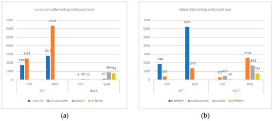 The distribution of verb readings in (N)ACT voice morphology per verb class in written (ILSP) and quasi-oral speech (Web): (a) ‘voice non-alternating’ anticausatives; (b) ‘voice alternating’ anticausatives.
