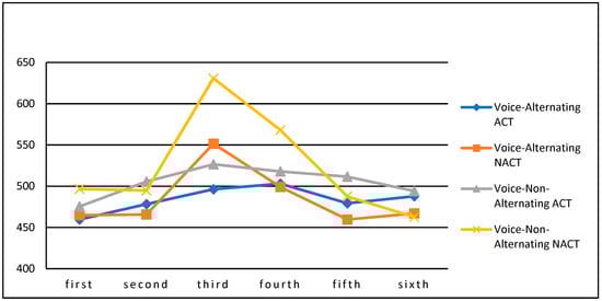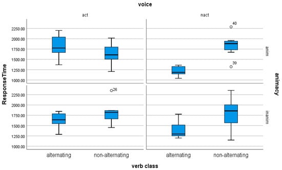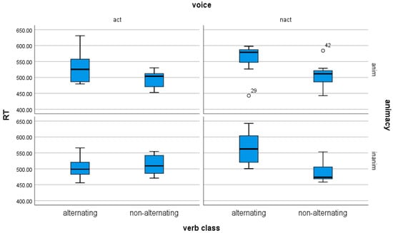 Narrowing down the scope of analysis, we consider verb classes in relation to experimental variables, i.e., voice morphology and animacy of the syntactic subject (Figure 3). In the course of sentence processing, a verb class effect was evidenced only on the fourth segment. More specifically, an ANOVA with voice as the within-subject factor and verb class and animacy of the syntactic subject as the between-subjects factors revealed a significant voice effect (F(1,598) = 4.939, p = 0.027) and a significant interaction between voice and verb class (F(1,598) = 6.731, p = 0.01): NACT verb forms received shorter RTs than ACT ones in the case of voice alternating anticausatives, and longer RTs in the case of voice non-alternating anticausatives.