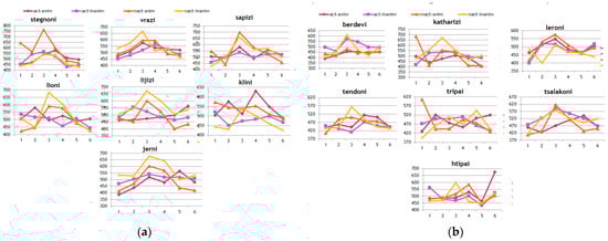 Among ‘voice alternating’ anticausatives (Figure 4b), berdevi (mingle) revealed no significant effects during processing. In katharizi (clean), a significant voice effect was found on the third segment (F(1,41) = 6.582, p = 0.014) only; processing of sentences including leroni (spill) revealed no significant effects either. In tendoni (stretch), we found a significant voice effect only on the third verb segment (F(1,41) = 6.040, p = 0.018). In tripai (pierce), main effects were not significant across sentences, but an interaction of voice by animacy was marginally significant during later stages of processing, on the sixth segment (F(1,41) = 3.923, p = 0.054), though no significant differences were identified by independent samples t-tests. Tsalakoni (crumble) yielded a significant voice effect long after processing the critical verb segment, i.e., on the fifth segment (F(1,41) = 5.325, p = 0.026), and it reappeared on the seventh segment (F(1,41) = 6.646, p = 0.014), the end of the sentence. Finally, htipai (hit) revealed no significant effects during sentence processing.