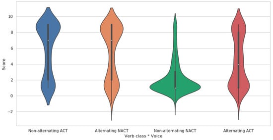 Violin plot: distribution of the degree of acceptability (by voice morphology, verb class).