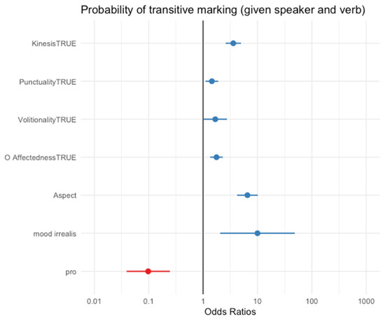 Like the previous studies of English-lexified contact languages, ‘high’ value variables from Hopper and Thompson correlated with a higher frequency of the transitive suffix. For example, verb stems coded with a high level of kinesis had overt transitive marking 80.2% of the time, while stems with low kinesis had overt marking 18.8% of the time (Batchelor 2017, p. 35). Kinesis (80.2%) and affectedness of O (84.5%) had the strongest correlations, followed by volitionality (52.3%) and agency of A (53.1%). The single-level mixed effects model confirmed that kinesis and affectedness of O, followed by volitionality and agency, were the best predictors of transitive marking. The remaining features were not statistically significant predictors, even when correlations were found with transitive marking (Batchelor 2017, p. 36).