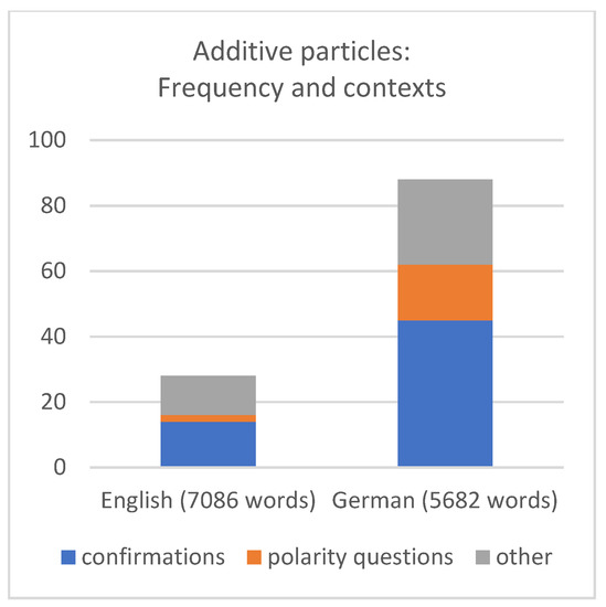 There are substantial differences between German and English with respect to the absolute frequency of additive particles. The ten German dialogues contained more than three times more additive particles than the fourteen English dialogues. Figure 1 shows their distribution across polarity questions, confirmations and other contexts.