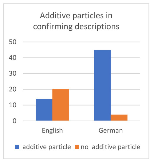 The corpus consists of 83 confirming descriptions. As shown in Figure 4, they are less frequent in English than in German, despite the bigger corpus, and importantly, the majority of the English descriptions does not contain an additive particle, whereas this is clearly the exception in German.