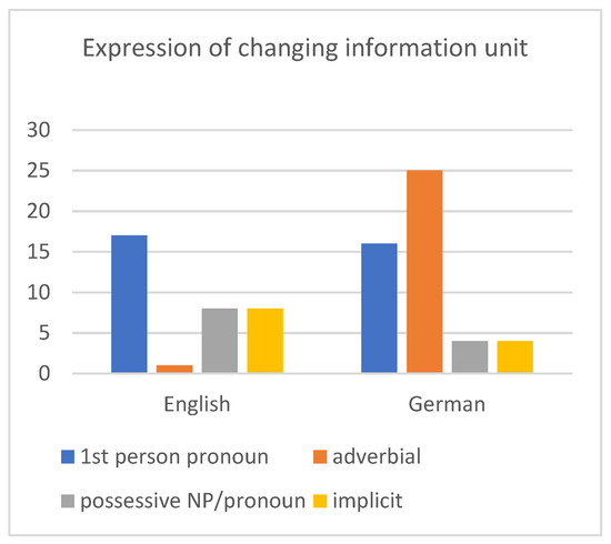 It seems, thus, that the word order constraints of German and English play a major role in determining the information flow in confirming descriptions. Whereas possessive subjects are an ideal solution for encoding the changing information unit in both languages (restricted, however, to confirming properties/locations), first-person subject pronouns encoding the changing discourse alternative are bound to the initial position in English, but not in German. German V2 word order provides speakers with a multifunctional initial position that can host the topic and dissociate it from the expression referring to the current speaker. This is not easily possible in English (SVO), where the subject has to perform “triple duty” (Los and Starren 2012). Additive particles applied faute de mieux to an initial subject (24) might highlight the changing information more than is warranted in the dialogue task, where a non-contrastive addition of information about the two pictures is expected. Note that there is not a single occurrence of auch pre-posed to its AC in German (#auch [ich] habe eine gelbe teekanne; #eine gelbe teekanne habe auch [ich]). Pre-posed additive particles associate with a focused AC that would lead to an even stronger contrastive relation with the relevant discourse alternative.
