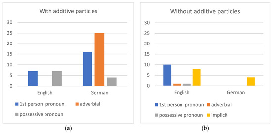 Additive descriptions with possessive subjects are, however, restricted to confirming the properties or the location of the relevant entities (21), (22). For the confirmation of the existence of a particular entity, speakers have to resort to first-person subject pronouns combined with the verb “have”. Reference to speaker and entity are no longer mapped onto the same syntactic constituent (subject) and the syntactic constraints of German (V2) and English (SVO) therefore have an impact on suitability of this structure for the integration of additive particles. Figure 7 shows that first person pronouns are invariably in initial position in English, whereas this is clearly the exception in German.11 More often than not English first-person descriptions are realised without additive particles, again in stark contrast to German.