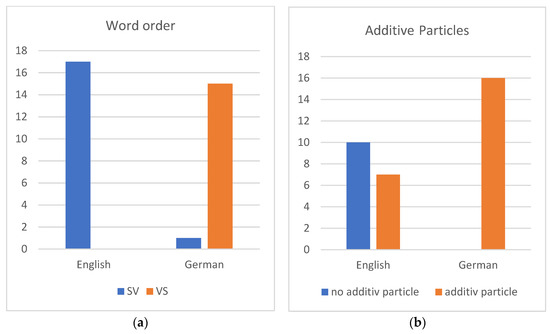 - Reimer, Laura, and Christine Dimroth. 2021. Added alternatives in spoken interaction: A corpus study on German auch. Languages 6: 169. [Google Scholar] [CrossRef]