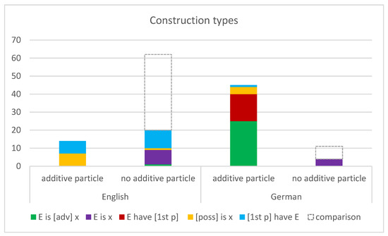 Frequency of the five construction types identified in confirming descriptions, absolute numbers. Square brackets in the structures indicate the position of the expressions encoding reference to the speaker (“bei mir”, “I”, “mine/my x”) that can be construed as the AC of an additive particle if there is one.