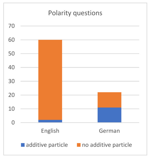 These overall frequency differences do not prevent us from noting that half of the polarity questions produced by speakers of German contain additive particles, whereas English speakers hardly use them at all. A Pearson’s chi-square-test revealed a highly significant association between language and particle use in polarity questions: X2(1) = 26.27, p < 0.001. Additive particles are much more frequent in German than in English, but less frequent than in German confirming descriptions (Figure 1). They are compulsory in verbless ellipses (bei dir auch? “in yours as well?”), but content wise, they are in principle as redundant in polarity questions as in confirming descriptions.